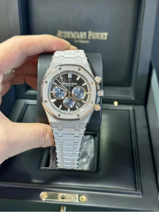 霜金工艺:表壳和表链采用了爱彼独有的“霜金”工艺。这种工艺通过使用带有钻石尖头的工具在金属表面进行锤击,形成微小的凹点,从而产生如钻石粉尘般璀璨闪烁的视觉效果。它比普通的抛光金更耐磨,且触感独特。